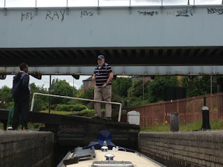 It was quite windy now and as we turned left the lock was right on us and a very awkward landing place to drop Geoff off. However I managed to get the nose in and he hopped off and prepared to make my approach to the lock. However Geoff then called (or rather signalled) that a boat was just entering the lock at the top.....this was only the second boat we had seen all day!!!